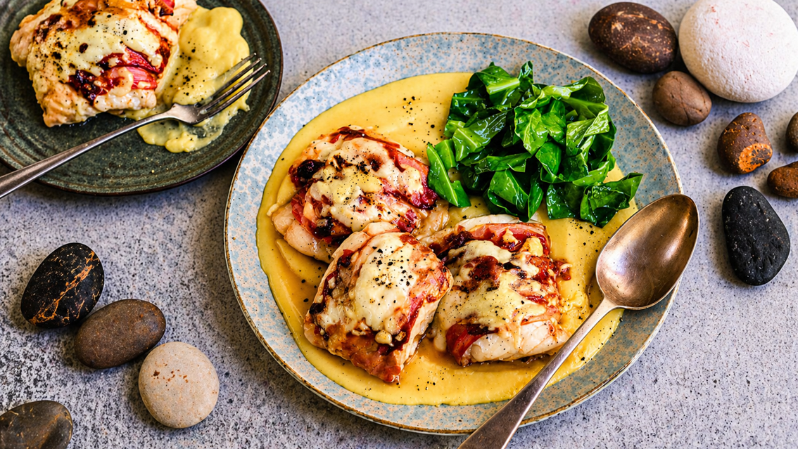 Strawbridge menjelaskan bahwa resep ini merupakan “interpretasi dari ayam cacciatore” dengan pendekatan baru yang lebih fleksibel. Ia menambahkan elemen rasa ala Louisiana untuk memberikan sentuhan asap dan manis yang khas. Kombinasi ini kemudian disempurnakan dengan polenta keju yang lembut, menciptakan keseimbangan rasa yang kaya namun tetap nyaman di lidah.
