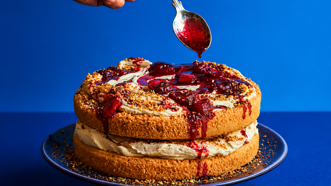 Selai dibuat dari stroberi dan raspberry yang dipanggang bersama gula, garam, dan lemon hingga menghasilkan tekstur kental alami. Rasa asam manis dari buah memberikan keseimbangan pada kue.