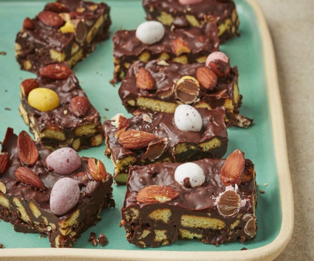 Rocky road versi ini menggunakan Mini Eggs sebagai sentuhan khas bertema Paskah. Warna-warni lapisan gula pada Mini Eggs memberikan tampilan yang menarik sekaligus rasa cokelat yang lebih variatif. Tak heran jika resep ini sering menjadi pilihan utama untuk sajian penutup cepat saji yang tetap terlihat elegan.