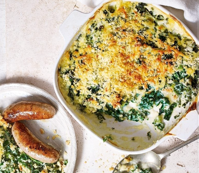 Kami telah memperbarui hidangan klasik sosis dan kentang tumbuk dengan sentuhan modern yang lebih sehat dan lezat. Kali ini, sosis disajikan bersama gratin kale krim keju yang kaya rasa, creamy, dan renyah di bagian atas. Hidangan ini sempurna untuk makan malam keluarga atau untuk sajian spesial akhir pekan. Kombinasi kale yang sehat, keju cheddar rendah lemak, dan sosis ayam bebas lemak menciptakan paduan rasa yang memanjakan lidah.